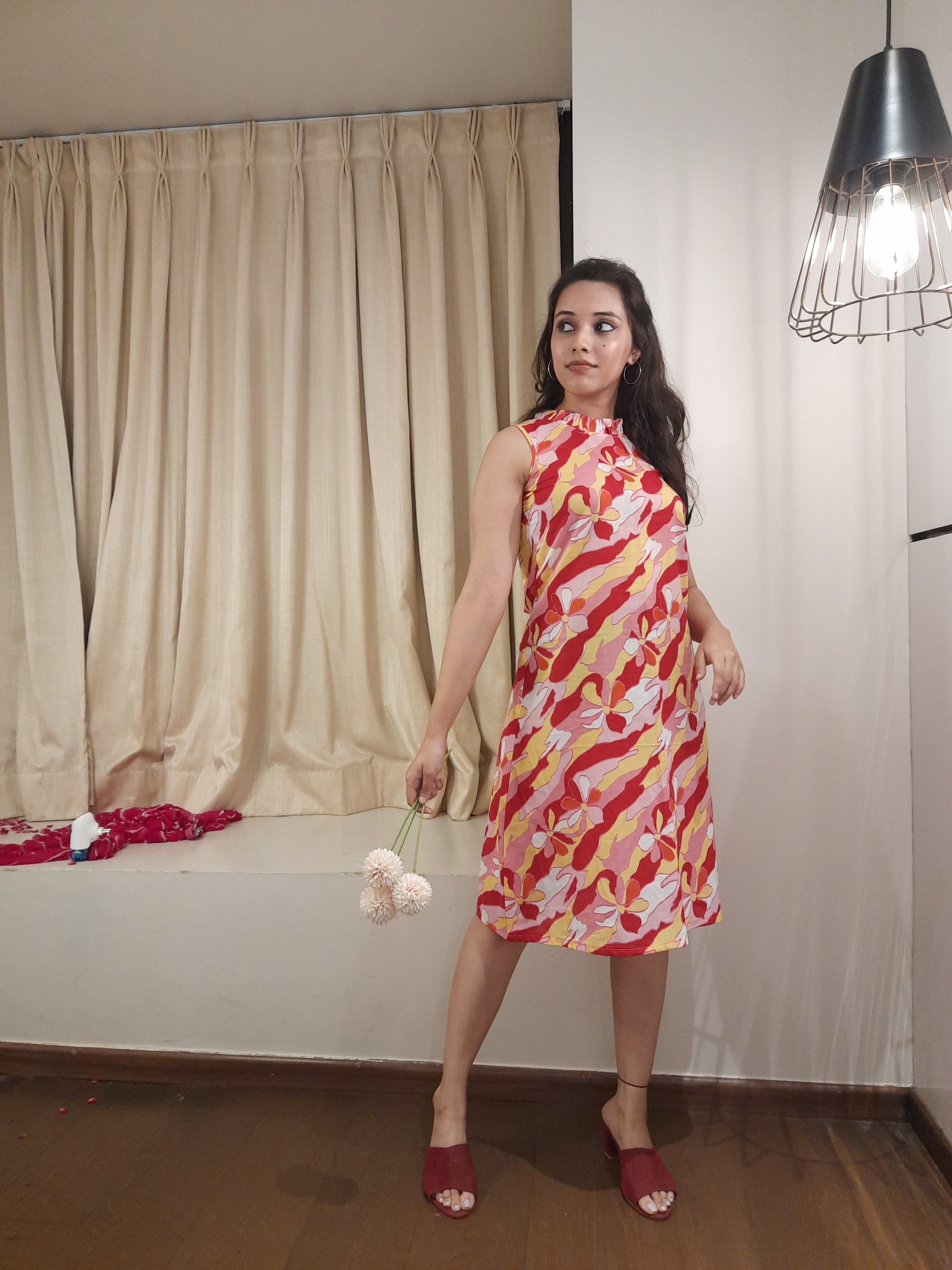 Add a touch of stylish drama with our Abstract Floral Cotton Kurta, designed with a bow-tie back detail and a pleated high neckline. The vibrant red, pink, yellow abstract-floral print makes it a bold yet elegant wardrobe piece. This sleeveless kurta, made of breathable cotton, works beautifully for brunches, casual parties or layered for festive outings. Pair it with palazzos or neutrals to let the print and back detail shine
