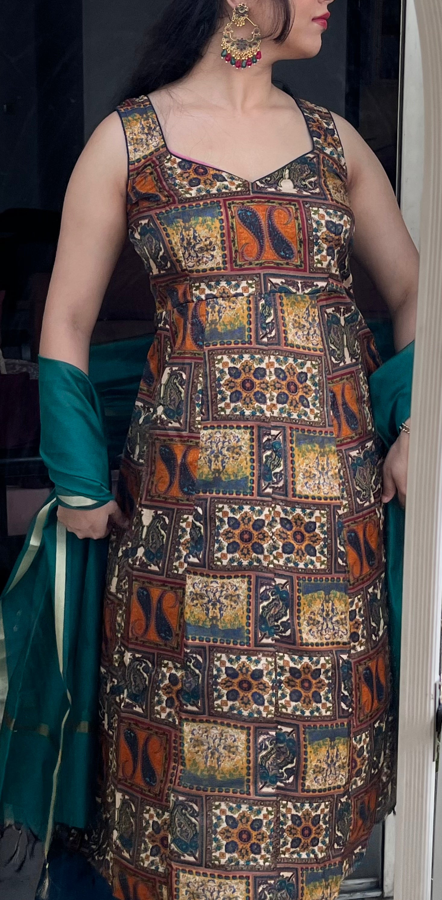 Step into effortless elegance with our Green Multicolor Anarkali Sleeveless Kurta Set, crafted for women who adore a fusion of comfort and style. Made with premium viscose fabric for the kurta and glace cotton pants, this set radiates luxury while ensuring breathability. The sweetheart neckline with delicate piping detailing adds charm, while the back dori design brings a graceful traditional touch. Perfectly paired with green pants and a flowy dupatta, this set is your go-to choice for festive gatherings, parties, or elegant casual wear