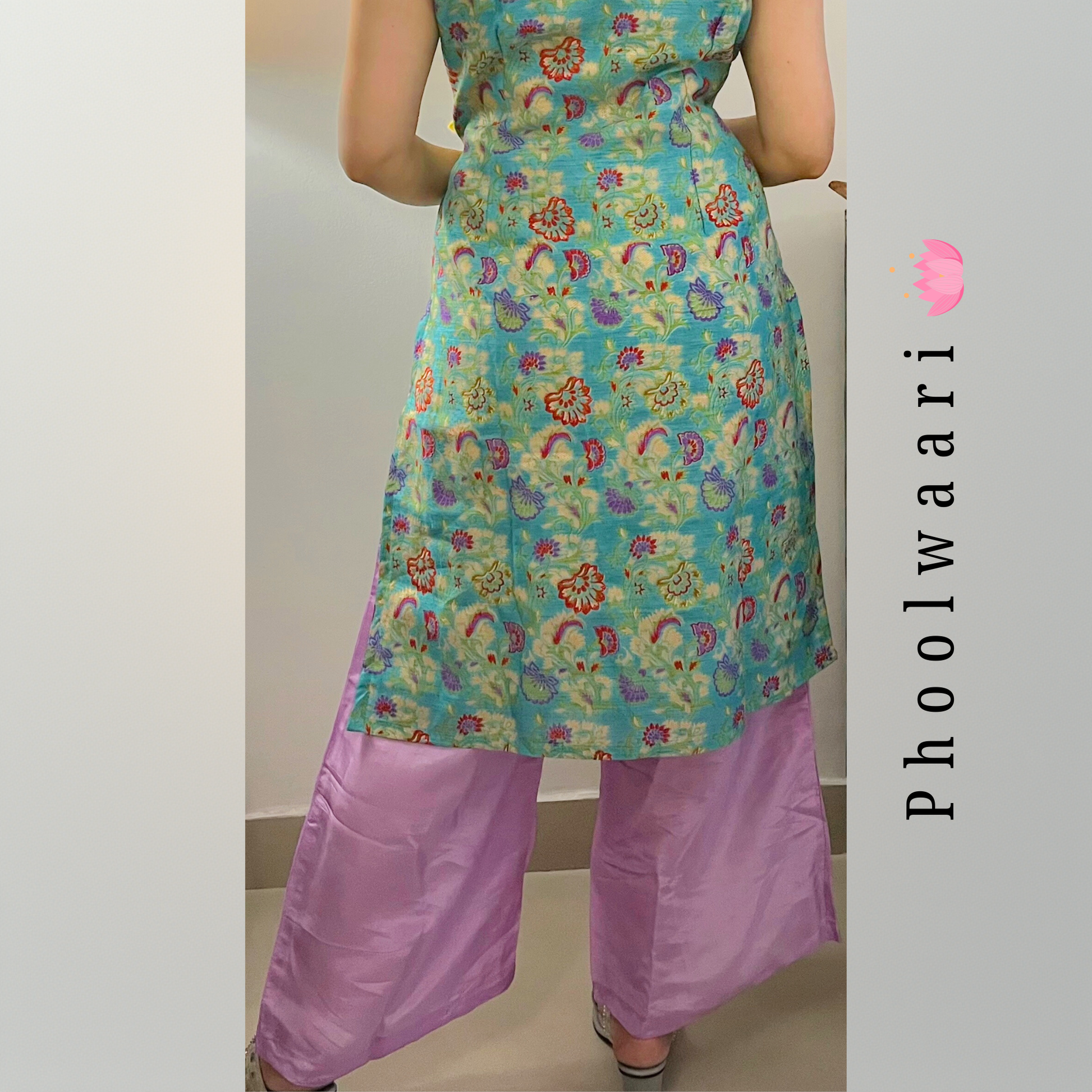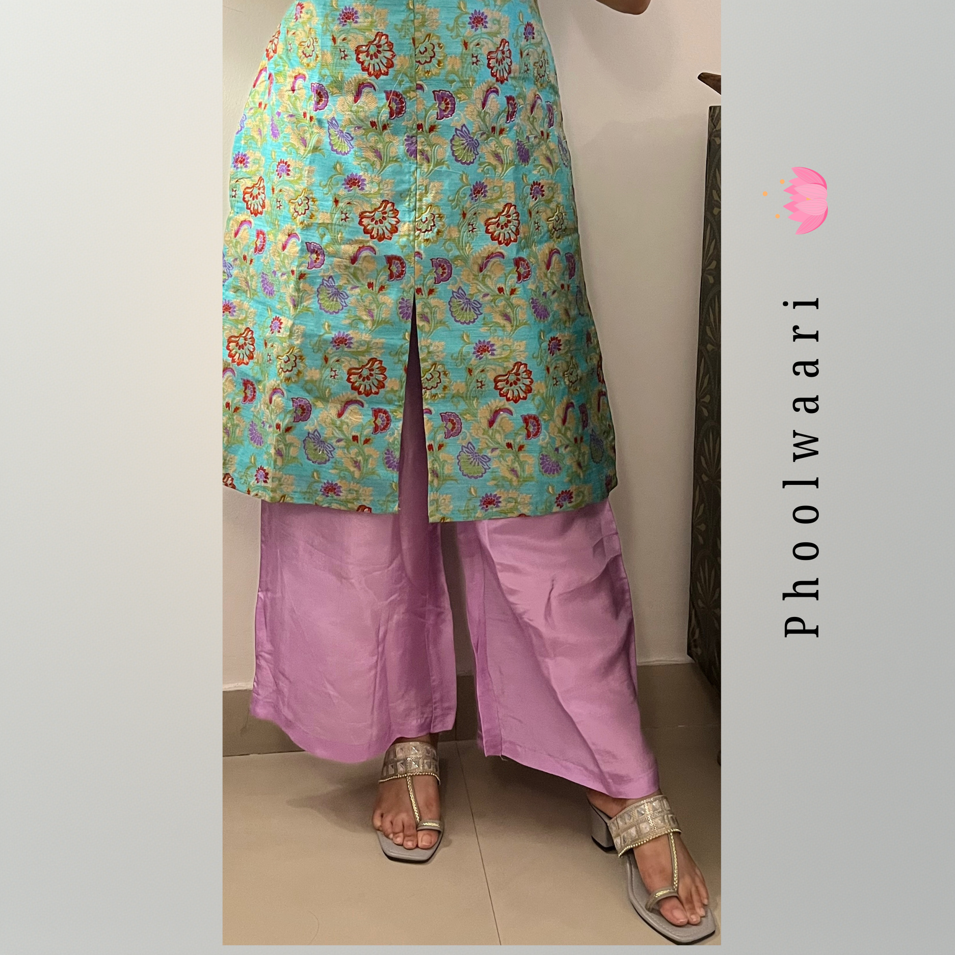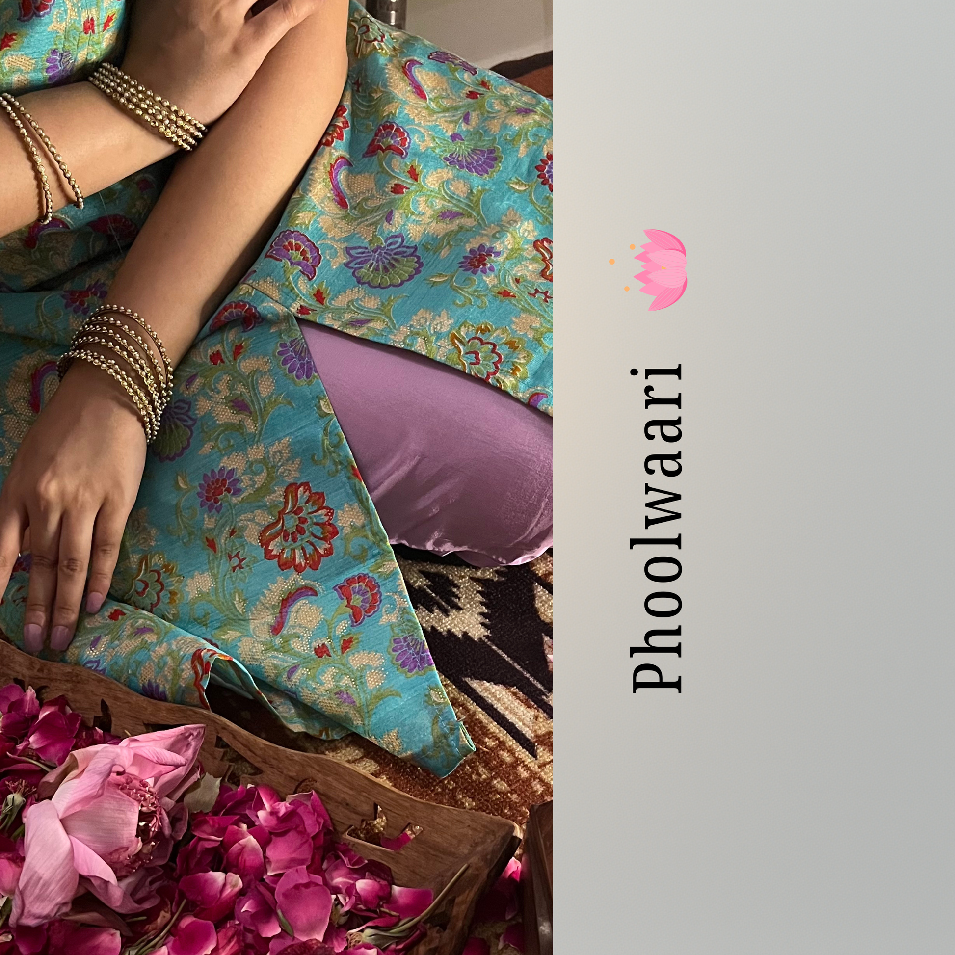 Step into the elegance of tradition with our Green Kingkhap Slit Kurta with Pants, a graceful blend of Banarasi craftsmanship and contemporary silhouette. Crafted from premium Kingkhap silk, this sleeveless kurta features exquisite Banarasi floral motifs that shimmer softly with every move. The V-neckline and front slit design offer a refined yet modern appeal, complemented perfectly by the contrasting lilac silk pants for a royal festive look. Whether it’s a festive gathering, wedding celebration, or evening soirée, this outfit adds poise and heritage charm to your wardrobe