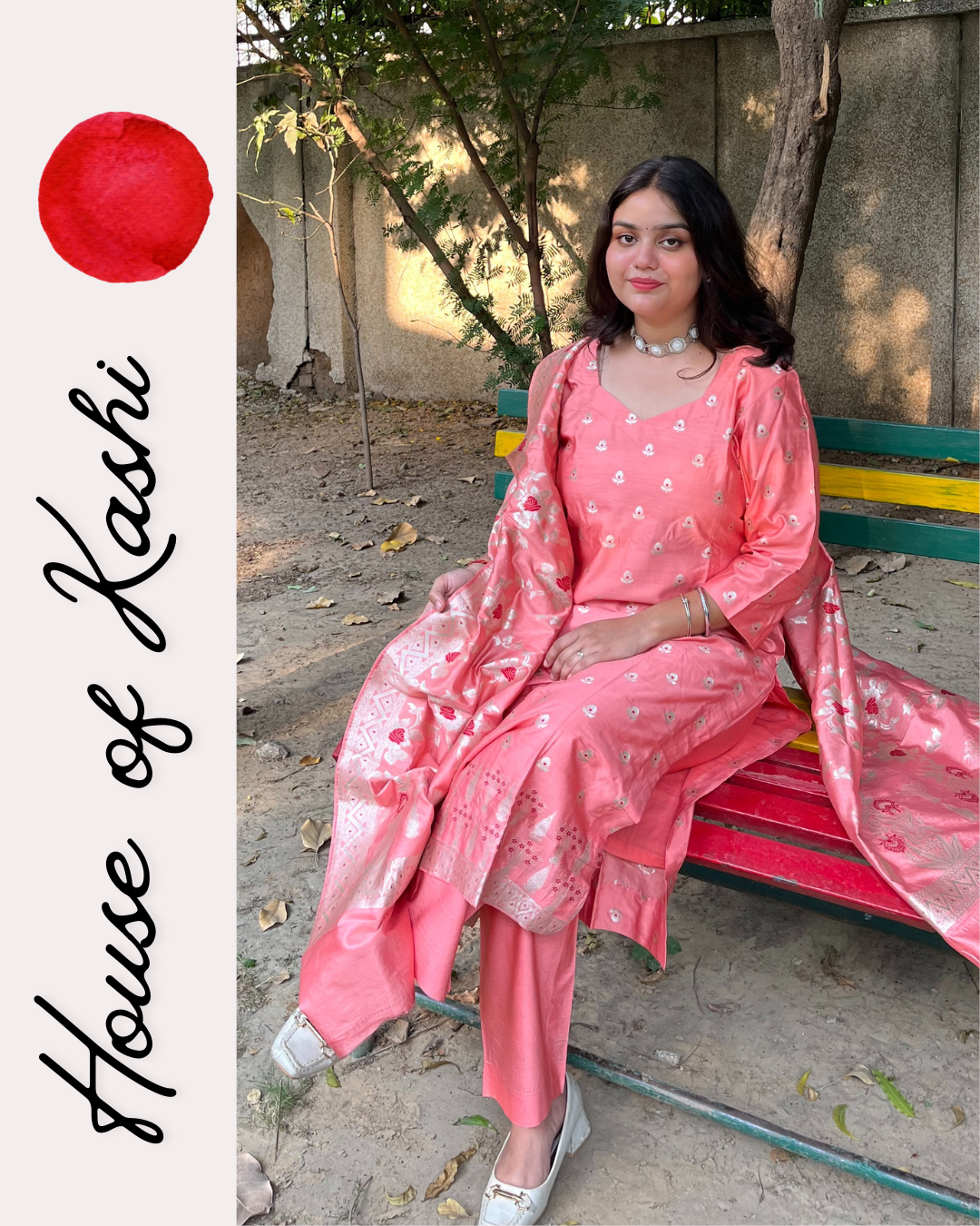 Coral Pink Banarasi Silk Kurta Set with Dupatta for Women | Elegant Festive & Wedding Wear